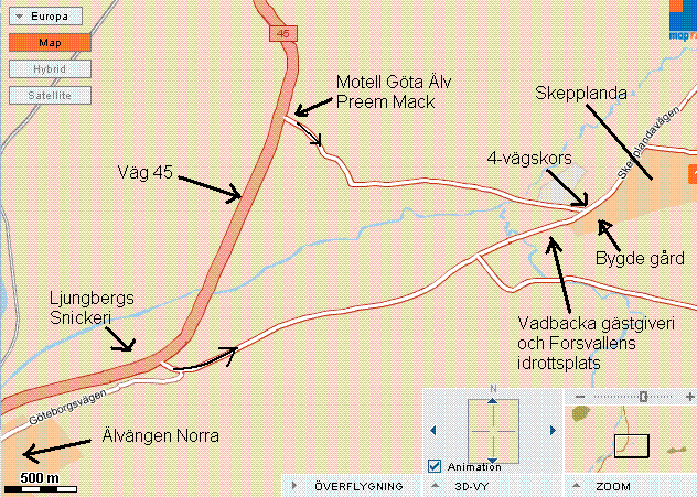 Norr ifrån - karta 1 o 2 Obs! Karta 1 visar INTE nya av o påfarter, rondeller, broar, m m. 45:an söderut. Strax efter Alvhem, skyltas Skepplanda. Tag av, motorvägs-avfarten (Motet Norra Skepplanda) och kör fram till rondellen. Kör genom rondellen, uppför backen till bron. Tag vänster och kör över motorvägsbron. Tag höger, kör förbi bensinmacken, till rondellen. Tag vänster i rondellen och du är på den "gamla" vägen mot Skepplanda. Efter 2,6 km kommer du till 4-vägskorset i södra Skepplanda (lite norr om Forsvallens idrottsplats och Vadbacka gästgiveri). Kör rakt fram 250 m in, på väg Åkersliden. Skyltat Bygdegård i 4-vägskorsningen! Bygdegården ligger i backen. Parkeringsplatser bakom och bredvid Bygdegården. Hem: Samma väg tillbaka till rondellen, följ skyltning E45 o Karlstad. |