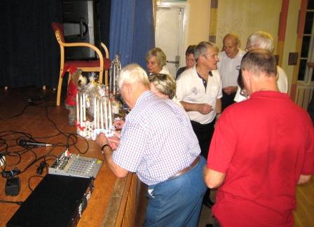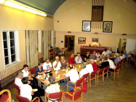 | Samlade vid bordet i pausen och bl a avnjutande frukt o godis. | Trängsel runt lotteriet! |